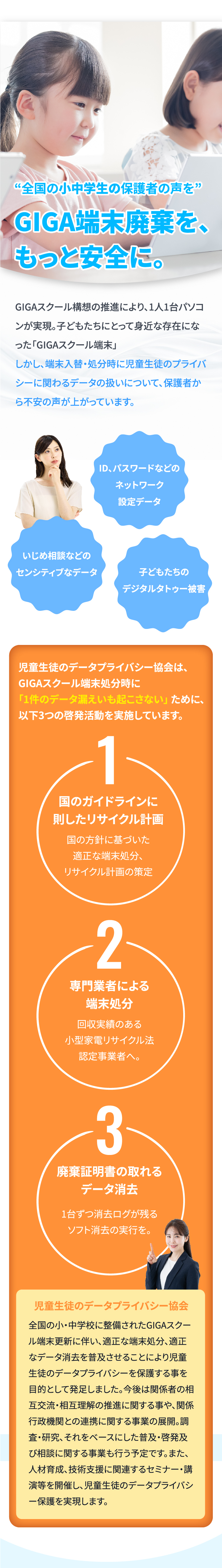 GIGAスクール構想は、児童生徒一人一台のICT環境の整備を実現した画期的なプロジェクトです。一方、端末回収時のデータ漏洩という新たな社会的課題が顕在化しつつあります。当協会は、生徒のプライバシーを守ることを最優先に、端末廃棄の適切な方法から政策決定プロセスの改善に至るまでの、社会システムとしての頼性を高める仕組みの構築を目指して活動してまいります。